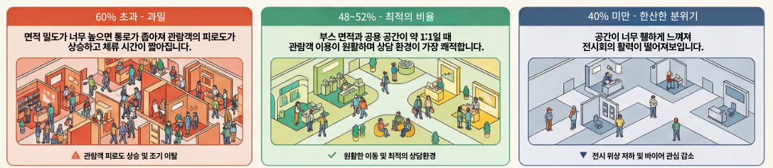 UFI(세계전시산업협회) 보고서에 따르면, 통로와 공용 공간이 부스 면적만큼 확보되는 1:1 비율(약 50%)일 때 관람객 이동이 가장 원활하며 최적의 상담 환경이 될 수 있다고 합니다.